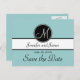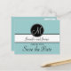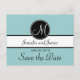 Elegant, Simple, Blue, Black and White Monogram Modern Save the Date Postcards. Elke Clarke © These wedding announcement postcards are shown with a light blue background, white monogram initial on a black circle tag and bride and groom names on a black and white stripe. Customise with bride and groom names and your wedding announcement text, monogram initial, and wedding date using Zazzle's easy to use menu prompts. This simple yet elegant monogram initial design works for all letters of the alphabet and is fully customisable. For other colour combinations please contact luxuryweddinginvitations@gmail.com