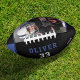 Blue Black Player's Name Number Photo Football. Personalise it with your photo, player's name, number and year. The text is trendy white and blue typography on a black background with a blue stripe. You can change any text on the football or erase it. A perfect gift for a football player, teammate or coach.