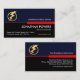 A stylish red border demarcates an upper blue layer against a black piece below. Riding this red border of success is your business name with a gold lightning bolt logo you can use, on the left. Just underneath the red tab lies your prestigious name, the job title with a slogan caption at the base of the card ; You can change the caption remarks to this to suit your own service needs. At the lower left corner is the contact details.