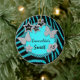 Commemorate your daughter's Sweet 15th or 16th birthday party with this chic and trendy customisable ceramic Quinceanera photo Christmas ornament. It has aqua blue FAUX glitter (PRINTED) and black zebra print animal stripes with a polka dots pattern and silver FAUX glitter (PRINTED) butterflies, stars, hearts, and a funky flower on it, with text boxes to add a name, and the date of your sweet 15th, sweet 16, Bat Mitzvah, or other special date to the front side and a spot for you to upload a photo into on the back. It can be changed to say your name, or other text. Everything will print as you see it on your monitor, so if you need help customising your text, please email niteowlstudio@gmail.com BEFORE you ord pink and black polka dot ornament. The text is fully customisable so you can change it to whatever you want.