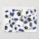 This cute soccer themed party invitation features clusters of blue, black and white soccer balls at the right and top edges on the front and a single cluster covering the back of the invitation - customise the party details on a white background - by katz_d_zynes