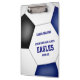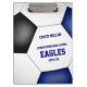 This soccer team colours clipboard for coach features the image of an abstractly oversized blue, black and white soccer ball upon which you can customise coach's name plus the school and mascot name and school year/season - by katz_d_zynes