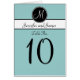 Simple Elegant Monogram Wedding Reception Table Number Cards with light blue background, white monogram initial on a black circle tag and bride and groom names on a black and white stripe. Customise with your wedding table number, monogram initial, names and wedding colours using Zazzle's easy to use menu prompts. This simple yet elegant monogram initial design works for all letters of the alphabet and is fully customisable to suit any colour combination. To order multiple cards, change the number and add one to your cart. Then Change the number again and add to your cart. So that you will have the same number of orders of one card as you need table numbers. Layout Design by Elke Clarke ©.