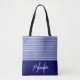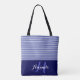 Blue, black and white narrow horizontal stripes cover the top of this Tote Bag, with a navy blue colour block below it. Embellish with your monogram and name.