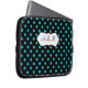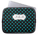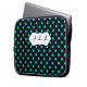 This chic monogrammed aqua blue and black polka dots laptop sleeve has a text box for you to customise with your own name, initials, business name, or other text. If you need any help customising, please email niteowlstudio@gmail.com.