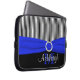 This personalised black and white striped laptop sleeve with a cobalt blue FAUX ribbon and jewel brooch has text boxes for you to customise with your own name, monograms, business name, or other text. If you need any help customising, please email niteowlstudio@gmail.com.