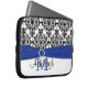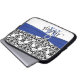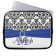 This personalised white, black and blue damask laptop sleeve with a FAUX ribbon and jewel brooch has text boxes for you to customise with your own name, monograms, business name, or other text. If you need any help customising, please email niteowlstudio@gmail.com.