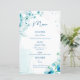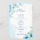 This wedding menu card exudes a soft, calming elegance with its cool blue floral design. The watercolor-style flowers flow gracefully along the upper left and lower right corners, giving the card a delicate, airy feel. The background is a subtle wash of pale blue tones, reminiscent of a watercolor sky, which enhances the card’s gentle aesthetic. The script font used for the names is both elegant and modern, while the additional text is presented in a clean serif font, ensuring readability while maintaining sophistication. Ideal for a spring or beach wedding, this invitation creates a serene and inviting first impression for your special day.