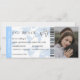 Modern minimalist blue monogram boarding pass wedding ticket with a simple white and brown background, a photo of the engaged couple, a plane with a loop trail, and a personalised save the date template that is easy to personalise. Don't forget to update the monogram text on the back.