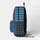 Blue backpack perfect for your dog's treats and toys and blankets with a blue and black pattern of bones and balls and paw prints with stripes and a blue buffalo check, personalised with your dog's name beneath a paw print. Blue paw print backpack personalised with name in a white script with a mix of patterns like stripes, blue buffalo check, and bones and balls and paw prints.