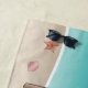 Destei's original cartoon illustration of a cute blue and white coat colour Boston Terrier breed dog standing in a tropical summer beach scene. On the beige colour sand there is a palm tree, a pink seashell together with a starfish and a red crab. The water is turquoise blue with some waves and the sun is shining above the horizon. There is also a personalizable text area for a name.
