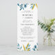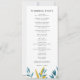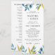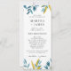 This blue botanical wedding program features soft watercolor leaves, modern fonts, and a clean one-column layout. The front includes the full ceremony order, and the back lists all members of the wedding party. Fully editable to match your names, roles, and message.