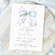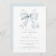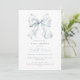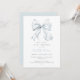 Minimal baby shower invitation that features an elegant blue bow and background.