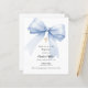 A white background, decorated with a light blue large bow and a golden cross. Personalise and add the name and details details.