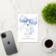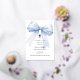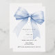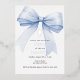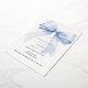 A white background, decorated with a blue large bow and a golden cross. Personalise and add the name and details details.