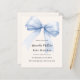 A soft beige, cream coloured background, decorated with a large light blue bow. Personalise and add a name and party details.
