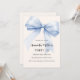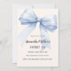 A soft beige, cream coloured background, decorated with a large light blue bow. Personalise and add a name and party details.