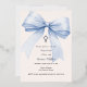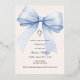 A soft beige, cream coloured background, decorated with a blue large bow and a golden cross. Personalise and add the name and details details.
