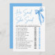 Add a touch of fun and elegance to your bridal shower with the "He Said, She Said" game featuring a charming blue bow design. This engaging activity invites guests to guess whether each statement was made by the bride or groom, sparking laughter and conversation.