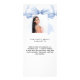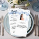 Birthday party menu card. Personalise and add a name, age, date and the menu. A white background and a large blue bow.