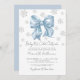 Celebrate the winter season and the mum-to-be with this sweet and classic baby shower invitation featuring a soft blue watercolor bow. Light grey watercolor snowflakes gently fall from the top, reaching about halfway down the design to create a subtle, wintry feel without overwhelming the clean layout.