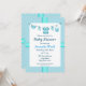 Blue baby shower invitations. On the front is a blue background colour with a pattern of tiny polka dots and a light blue ribbon crossed over in the middle. Over the background is a white rectangle space to add all your details. All text is in light and dark blue lettering. At the top of the rectangle is a washing line with blue baby clothes pegged to it. On the back is a blue background with tiny polka dots and a crossed over blue ribbon with a big blue bow in the centre.