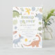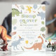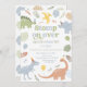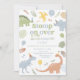 Cute dinosaur birthday invitation featuring hand-drawn dinosaurs, balloons, and tropical leaves in soft pastel colours of green, blue, peach, and yellow. A fun, gender-neutral design perfect for a 2nd birthday or any dino-themed party. Modern, whimsical, and easy to personalise.