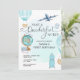 Onederful World Travel boy's 1st first Birthday features aeroplane, passport, hot air balloon, blue luggage, globe, camera and script heart calligraphy type.