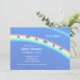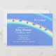 A baby shower invitation with umbrella and drops on a rainbow on a blue background. Customisable sample text is ready for you to edit with your own details.