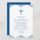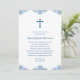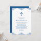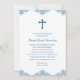 This classic, traditional boys baptism or christening invitation features a blue cross and a decorative blue design along the top and bottom edges of the invite. The text can be changed to suit a First Communion instead of a baptism or christening.