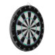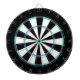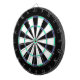 This dartboard is decorated with the colours blue, bright-green, black, and white.