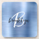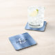 This elegant personalised coaster features a monogram and first name in modern black and white script on a light blue brushed metal background.