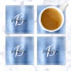 This elegant personalised coaster features a monogram and first name in modern black and white script on a light blue brushed metal background.
