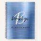This personalised recipe notebook features a monogram and first name in modern black and white script on a blue faux brushed metal background, with the additional text in black sans serif font below.