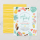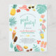 Blue | Budget Pineapple Tropical Pool Party Invitation. Celebrate in style with these fun invites. This design features a border of summer elements, "pool party" in modern script lettering, and your party information in trendy typography. The border consists of a pineapple, camera, sun hat, shades, tropical leaves, flowers, ice lollies, lemonade, flip flops, beach balls, lemons, doughnuts, watermelon, ice cream, and more! Click on "Personalise this template" to change the wording. If you want to change fonts, sizes, colours, or placement, scroll down to "Click to customise further" and use our design tool! Visit our store for more designs!