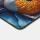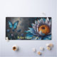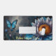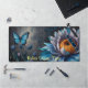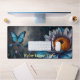 Blue Butterflies on Orange Bloom Desk Mat. This enchanting design features elegant blue butterflies fluttering amidst a stunning array of vibrant flowers. The centrepiece is a large, beautifully detailed flower with lush petals in shades of blue and purple, contrasted by a vivid orange center. The surrounding flora adds depth and richness to the composition, creating a serene and magical scene. Perfect for adding a touch of nature's beauty to your workspace, this design is both calming and visually striking.