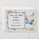 Blue Butterfly & Leaf Swirls Save the Date Flat Card. The front has a decorative frame where the information goes. The leaves are orange and dark blue. Trendy with the former Pantone wedding colours. Colours include shades of flame and blue. The background is grey with a spongy texture. The textured butterfly has a unique look. The back of the card has an area to exchange the photo of the couple for your own. Hit "Personalise this template" or "Edit" to change the text and any other item or size and style of this card. Change the font and colour of the text but make sure that it is a colour that will show up.
