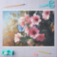 A delicate painting featuring a blue butterfly fluttering among vibrant pink flowers, celebrating the beauty of nature with soft, graceful charm.