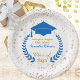 Paper plates for that special high school or college graduation party with personalised text. Features image of a blue grad cap and laurel wreath accented with faux gold confetti. See matching napkins and other colour groups also available in this same design