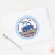 Blue Car transportation theme design. This cute round sticker is customised with your own 2-lines of text.