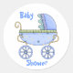 Sweet baby shower invitation / announcement envelope seal. Cute graphics of a colourful baby buggy, on a white background, with blue text reading Baby Shower, that you can personalise it to read anything you want. Great finishing touch to a baby boy's shower invitation.