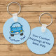 Smiling blue cartoon car. Custom background colour. Custom text on both sides.