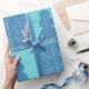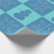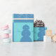 A trendy chequerboard pattern in shades of blue features a simple snowflake and a snowman. Perfect for wrapping those winter holiday gifts.