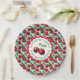 A watercolor ai illustration pattern of retro red cherries, sage green foliage and blue chequered plaid personalised birthday paper plates.