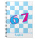 This blue chequered personalised 67 notebook design features bold pink and blue digits on a playful chequerboard background. Perfect for kids, students, and teens who love fun, custom styles. A bright, 67 number design adds flair and fun. Personalise with any name.