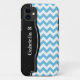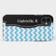 Stylish iPhone 5 case designed with a blue & white chevron zigzag pattern, a black frame over the left side, and personalised with your name or custom text in white across the black frame. This design is perfect for vertical and horizontal use of the iPhone 5.