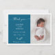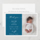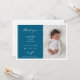 Celebrate with arrival of your precious miracle in style with this blue chic minimalist photo baby announcement card. The design features a white space for your first baby portrait, a clean navy blue rectangle to add names, birthdate, time, weight and birthplace. The modern calligraphy script reads "Thank you", adds grace and elegance to the template. Use the back to write a message of gratitude to friends and loved ones.
