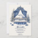 This elegant baby shower design features a beautifully detailed blue canopy crib adorned with festive garlands, set against a backdrop of snow-dusted pine trees and wrapped gifts. The classic navy palette and vintage watercolor style bring a timeless, wintery charm perfect for celebrating a baby boy during the holiday season.
