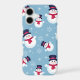 Cute christmas pattern with snowmen and snowflakes on blue background. Illustration of snowman is wearing a top hat and red scarf.