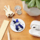 A whimsical, cute snowman dressed in a blue velvet top hat and waistcoat, surrounded by blue stars for Christmas.